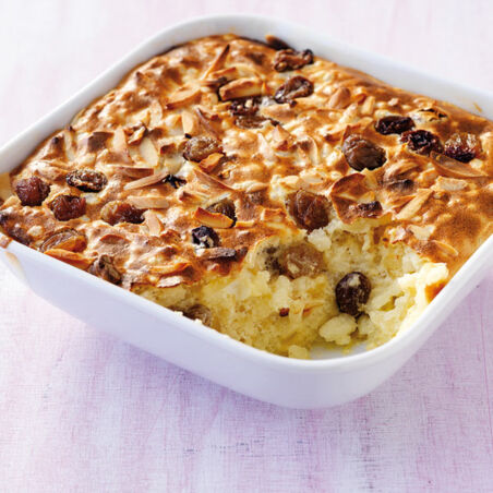 Irgendwo zwischen Milchreis und süßem Risotto wird dieser Reisauflauf durch Rosinen und Mandeln so richtig interessant für Leckermäuler.