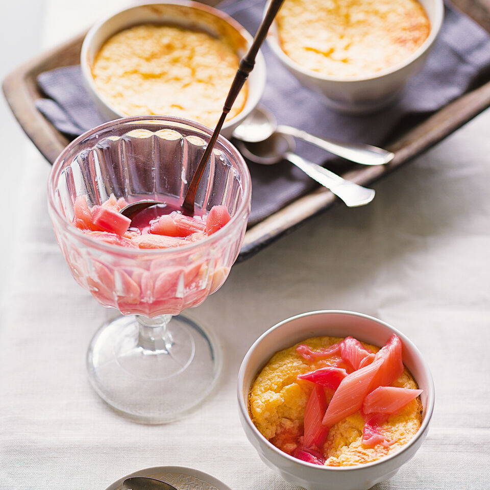 Den Rhabarber waschen und die Enden abschneiden, evtl. vorhandene Fäden abziehen. Rhabarber mit 80 g Zucker und 125 ml Wasser in einem Topf erhitzen und zugedeckt bei schwacher Hitze etwa 5 Min. garen. In eine Schüssel füllen und abkühlen lassen.