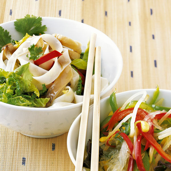 Pilze samt der Paprika wieder untermischen, Reisnudeln und Flüssigkeit dazugeben und alles in 1 Min. unter Rühren heiß werden lassen. Mit Salz und Cayennepfeffer abschmecken, mit Koriander bestreut servieren.