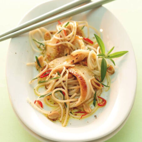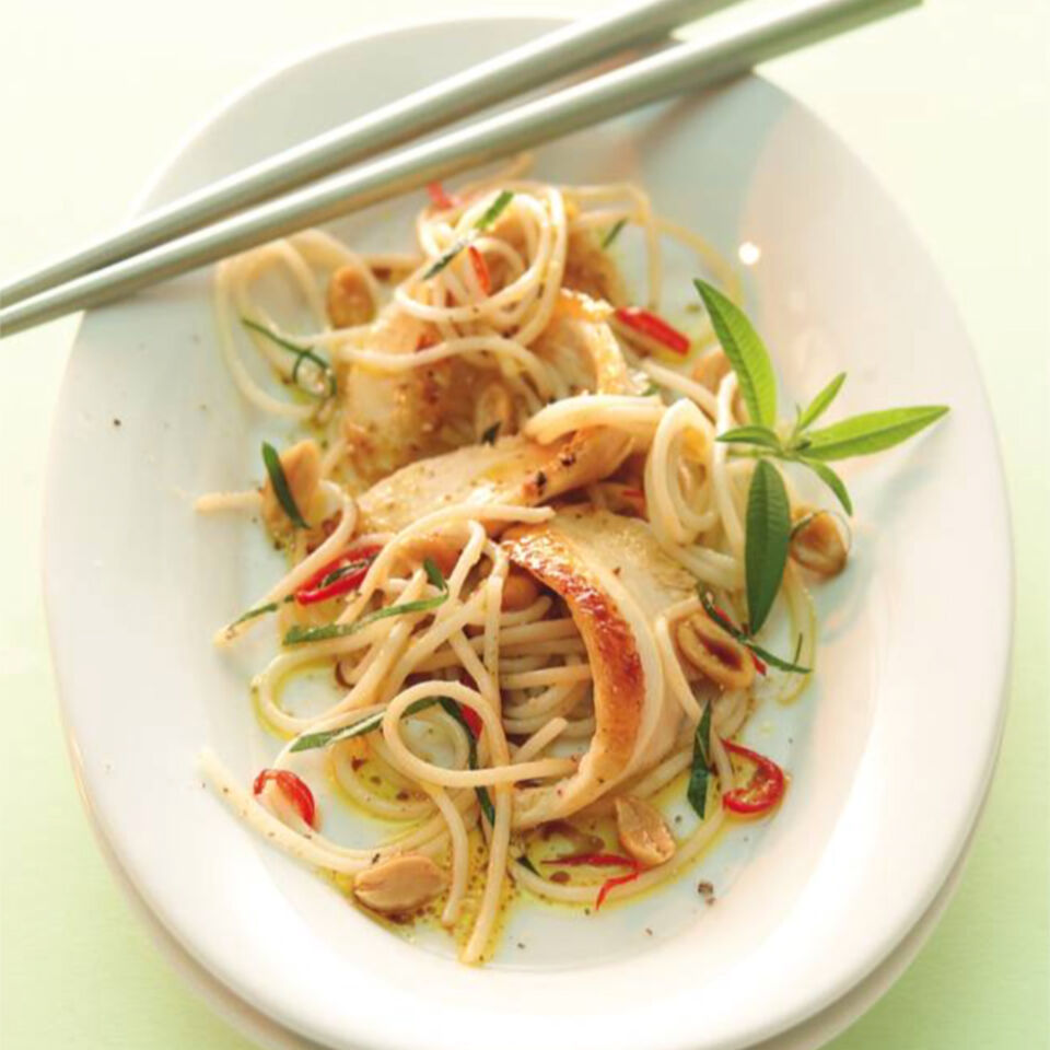 Die Hähnchenbrüste in Scheiben schneiden. Mit Erdnüssen und Reisnudeln unter das Dressing mischen. Den Salat kurz ziehen lassen, dann auf Tellern anrichten und nach Belieben mit Zitronenverbene garnieren.