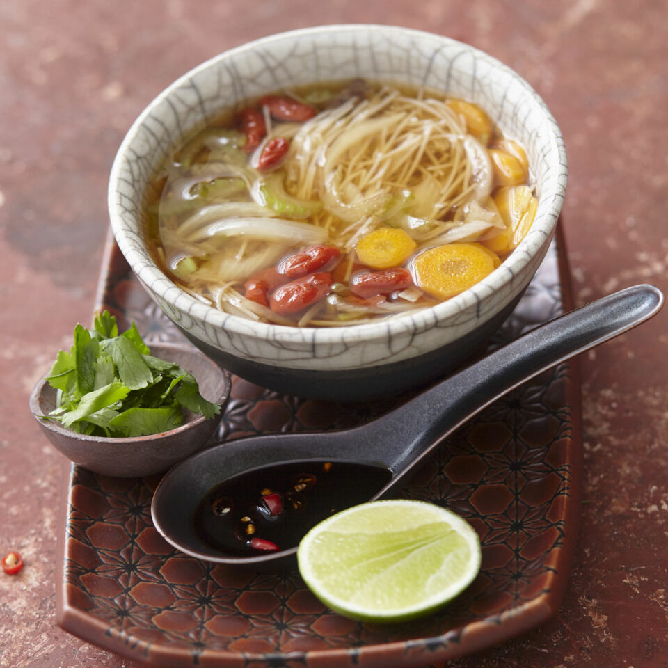 Reisnudeln in Salzwasser nach Packungsangabe garen, abgießen und in Suppenschalen geben. Gojibeeren, Gemüse und Brühe über den Reisnudeln verteilen.