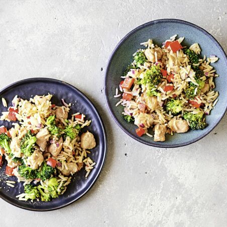 Die thailändisch angehauchte Reispfanne ist ein wenig wie ein One-Pot-Rezept, eben nur aus der Heißluftfritteuse und innerhalb von 35 Minuten auf dem Tisch.