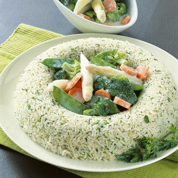 Eine Ringform (ca. 1 l Inhalt) gut einfetten. Petersilie waschen, trockenschütteln und die Blättchen fein hacken. Unter den Reis mischen, diesen in die Form füllen und etwas pressen. Auf einen vorgewärmten Teller stürzen, einen Teil des Gemüseragouts in die Mitte geben. Übriges Gemüse dazuservieren.