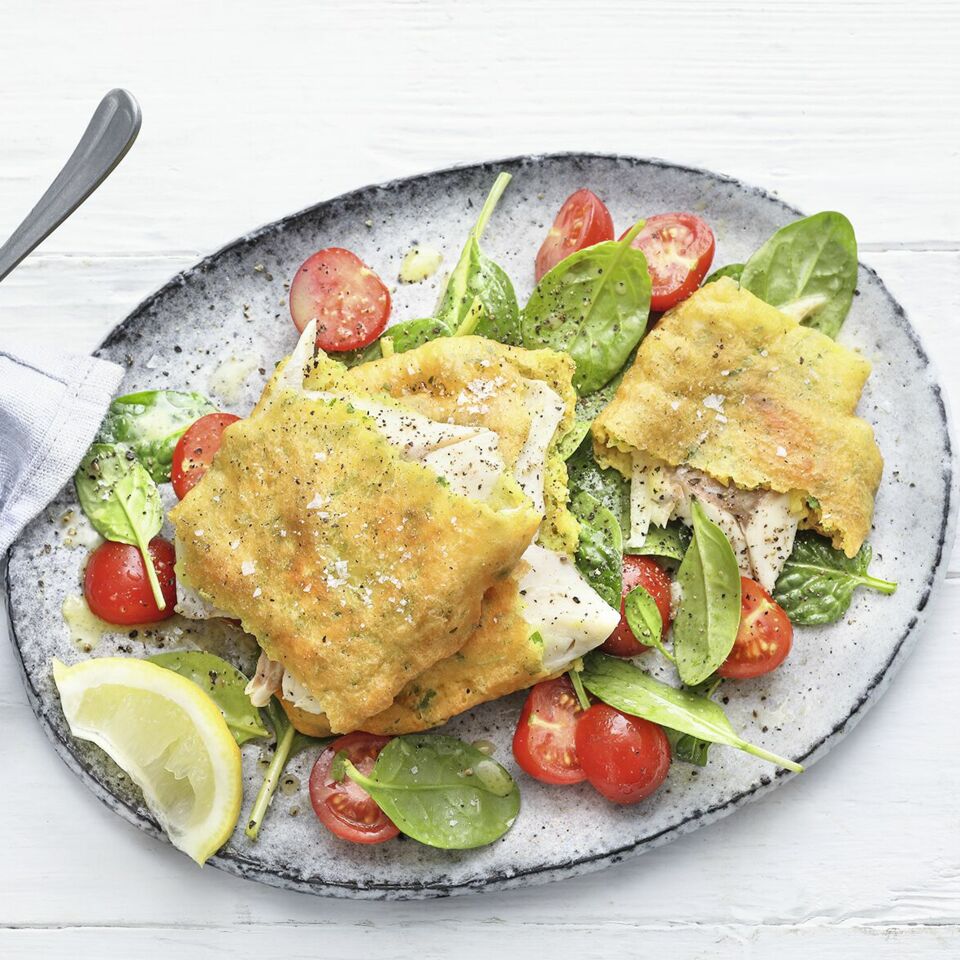 Die Petersilie waschen und trocken schütteln, die Blätter abzupfen, fein hacken und unter den Teig rühren. Das Öl in einer großen Pfanne erhitzen. Die Fischfilets auf Gräten untersuchen und diese ggf. entfernen. Filets trocken tupfen und durch den Teig ziehen. Portionsweise bei mittlerer Hitze in 1 ½-2 Min. goldbraun backen, wenden und auf der zweiten Seite ebenfalls in 1 ½-2 Min. goldbraun backen. Den Backfisch auf Küchenpapier entfetten.