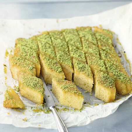 Den Kuchen herausnehmen, noch warm mehrmals mit einem Holzstäbchen einstechen und den Sirup löffelweise darübergeben. Mit den Pistazien bestreuen und abkühlen lassen. Dann den Revani mithilfe des Backpapiers aus der Form heben und in Würfel oder Rauten schneiden.