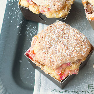 Für den Belag den Rhabarber waschen, putzen und schräg in 2 cm breite Stücke schneiden. Mit 60 g Rohrzucker mischen. Die Beeren putzen, Erdbeeren abbrausen und vierteln. Die Crème fraîche mit den Eigelben, dem Vanillezucker und dem Bindemittel glatt verrühren.