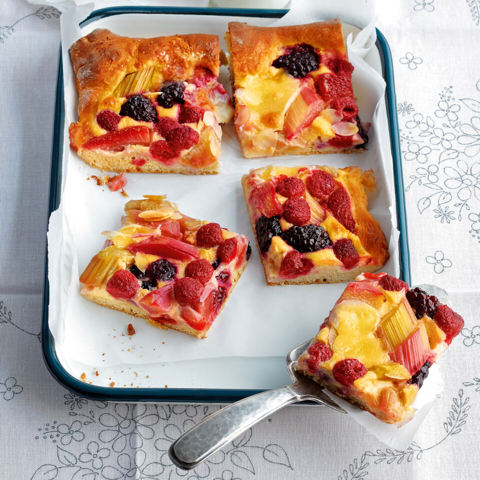 Den Backofen auf 220° (Umluft 200°) vorheizen. Backblech mit Backpapier auslegen. Hefeteig auf der bemehlten Fläche nochmals gut durchkneten und möglichst dünn rechteckig ausrollen. Das Blech mit dem Teig auskleiden, dabei einen Rand formen. Die Vanillecreme auf den Teig streichen, Rhabarber und Beeren darauf verteilen.