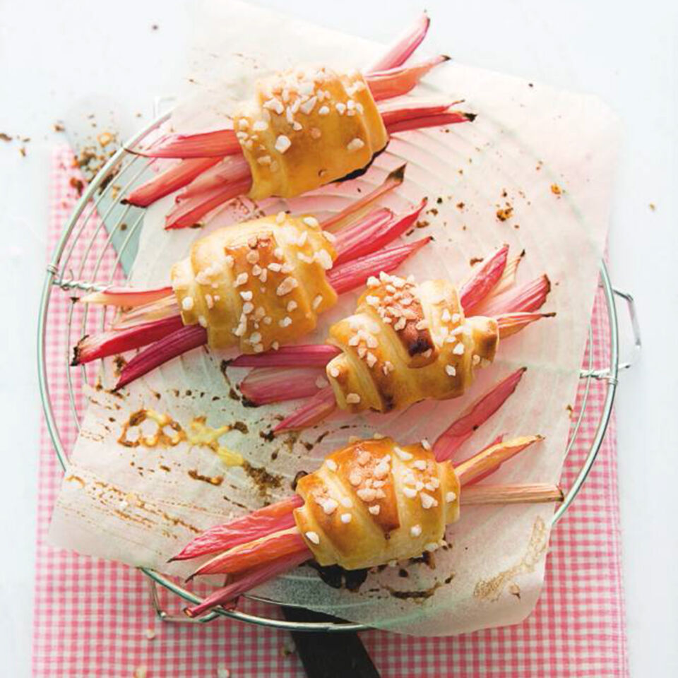 Den Blätterteig in 10-12 ca. 5 x 10 cm große Streifen schneiden. Jeweils 3-4 Rhabarberviertel mit einem Blätterteigstreifen umwickeln. Die Päckchen nebeneinander auf das Backblech legen.