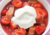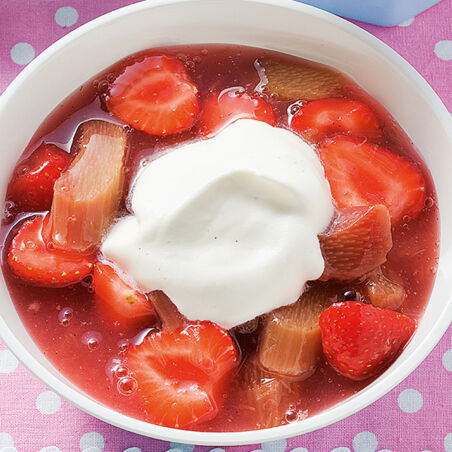 Rhabarber und Erdbeeren passen farblich und geschmacklich sehr gut zueinander. Und die Vanillecreme bildet das i-Tüpfelchen auf diesem Nachtisch.