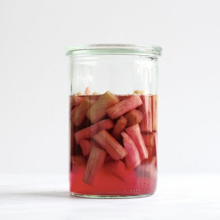 Den Rhabarber samt Saft und nicht aufgelöstem Zucker in ein großes Einmachglas (ca. 0,7 l) geben. Mit dem Wodka aufgießen. Die Mischung fest verschlossen 3-4 Wochen ziehen lassen - während dieser Zeit den Rhabarber am besten mit einem Gewicht beschweren (z. B. mit dem Glasdeckel eines Einmachglases oder einem kleinen Teller), sodass er von Alkohol bedeckt ist.