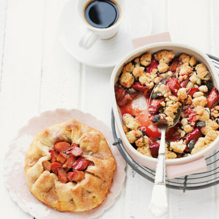 Rhabarber putzen, waschen, schälen und in ca. 5 cm lange Stücke schneiden. Mit der Stärke und dem übrigen Zucker mischen und in die Auflaufform geben. Die Streusel darauf verteilen. Im Backofen (Mitte) in 40-45 Min. goldbraun backen. Warm servieren.