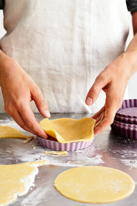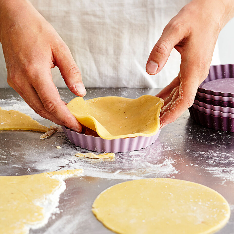Mit einem Ausstecher 12 Kreise ausstechen und die Teigkreise in die Tarteletteförmchen legen.