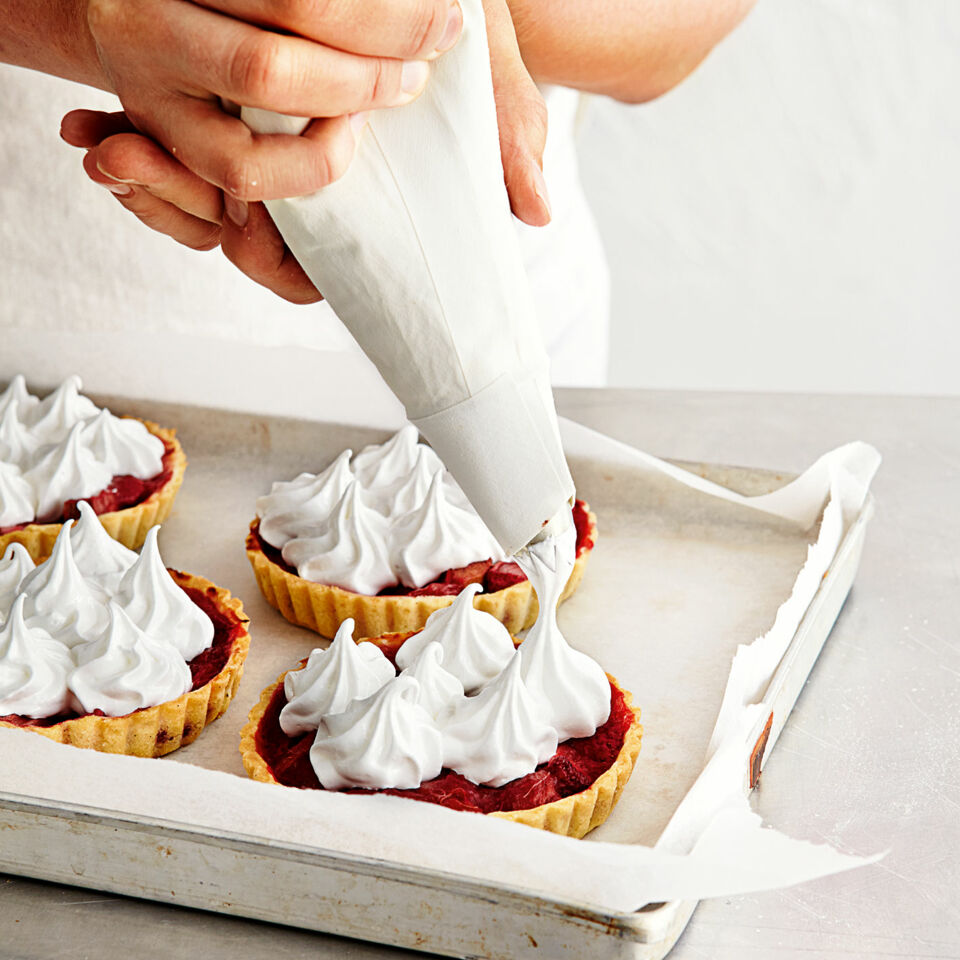 Den Eischnee mit einem Spritzbeutel mit Sterntülle in Spitzen auf die Törtchen spritzen oder mit einem Löffel darauf verteilen. Im Ofen (oben) 2 - 3 Minuten backen.