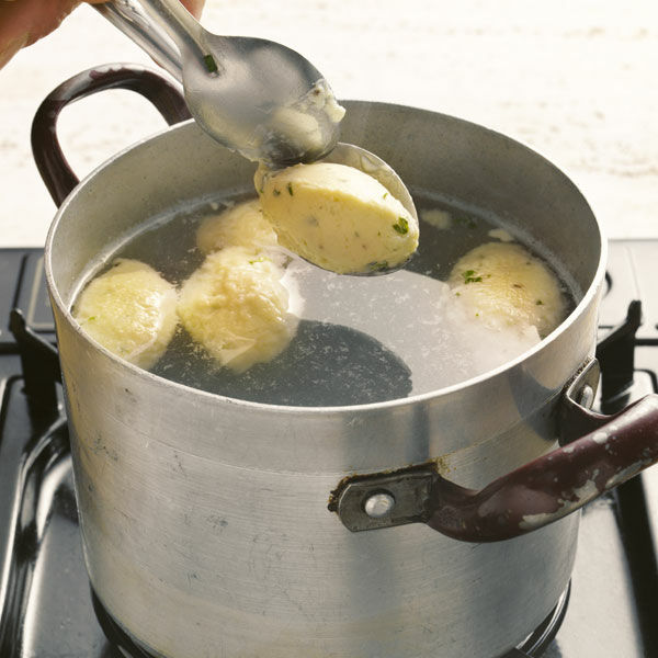 Vom Ricottateig mit zwei Löffeln Gnocchi abstechen und ins leicht siedende Salzwasser gleiten lassen. Die Gnocchi darin offen etwa 10 Min. ziehen lassen, bis sie an die Oberfläche schwimmen.