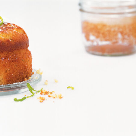 Gläser aus dem Ofen nehmen. Zum Aufbewahren heiß verschließen, die Kuchen halten sich kühl gelagert mind. 2 Wochen. Zum Servieren Kuchen abgekühlt aus den Gläsern stürzen. Mit Puderzucker bestäuben, mit Limetten-Zucker und Minzeblättchen garnieren.