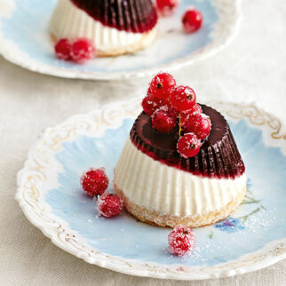 Vor dem Servieren Johannisbeerrispen waschen, trocken tupfen und mit Puderzucker bestäuben. Rosmarin abbrausen, trocken tupfen und in kleine Zweigchen schneiden. Die Torte mit Johannisbeerrispen und Rosmarin dekorieren.