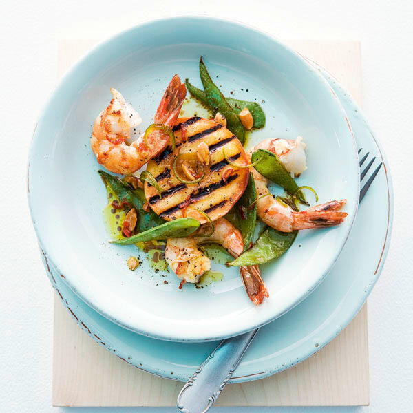 Gleichzeitig die Pfirsiche auf einen heißen Grill oder in eine Grillpfanne geben und 4-5 Min. grillen. Die Pfirsichhälften mit den Riesengarnelen und Zuckerschoten auf Tellern anrichten und mit der Vinaigrette beträufeln. Die Erdnüsse darüberstreuen. Sofort servieren.