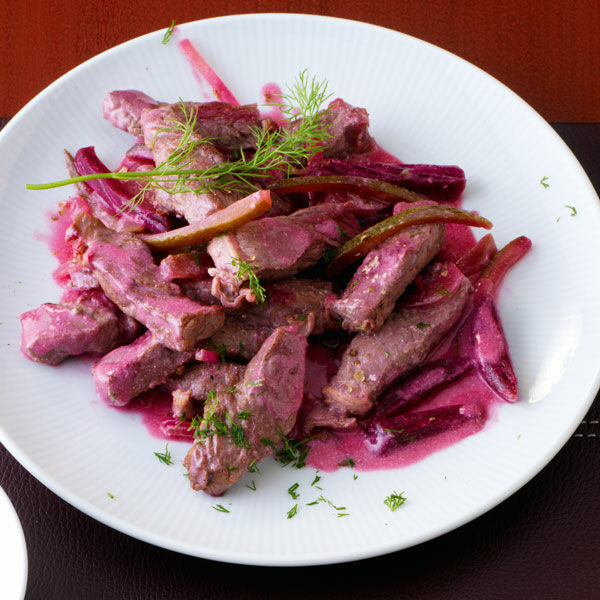 Rindergeschnetzeltes mit saurer Gurke und Roten Beten