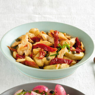 Das Gulasch von Sehnen und Fett befreien und trockentupfen. Zwiebeln und Knoblauch schälen. Zwiebeln achteln, Knoblauch in Scheibchen schneiden. Getrocknete Tomaten fein würfeln. Den Ofen auf 200° vorheizen.