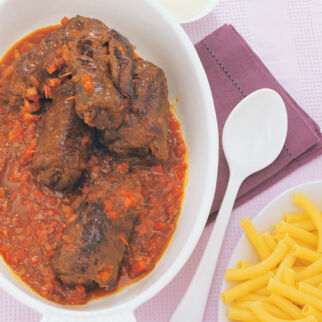 Das Butterschmalz in einer großen Pfanne erhitzen. Die Rouladen darin rundum braun braten, herausnehmen. Die restlichen Zwiebelspalten und Paprikastreifen im Bratfett anbraten. Tomatenmark zufügen und unter Rühren anrösten. Nach Belieben mit 1/8 l Wein ablöschen und fast vollständig einkochen lassen. Den restlichen Wein angießen und wieder etwas einkochen lassen.