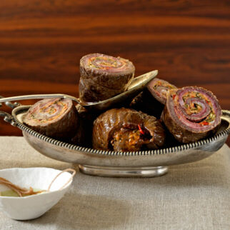 Die Rouladen mit je 1 TL Senf bestreichen und mit 2-3 Scheiben Speck belegen. Je 1 Gewürzgurke auf die schmale Seite der Rouladen legen. Auf beiden Seiten der Gurke je 2 Paprikastreifen legen und mit etwa zwei Dritteln der Zwiebeln abdecken. Die Rouladen fest aufrollen und mit Küchengarn zusammenbinden.