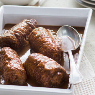Einen Topf oder Schmortopf auf mittlerer Stufe erhitzen, das Öl hineingeben und die Rouladen darin bei mittlerer Hitze auf allen Seiten 4-5 Min. anbraten. Herausnehmen, die übrigen Zwiebeln anbraten und mit der Hälfte der Brühe ablöschen. Die Rouladen wieder hineinlegen und zugedeckt bei kleiner Hitze ca. 1 Std. schmoren, dabei alle 15 Min. die Sauce umrühren und nach und nach die übrige Brühe dazugießen.