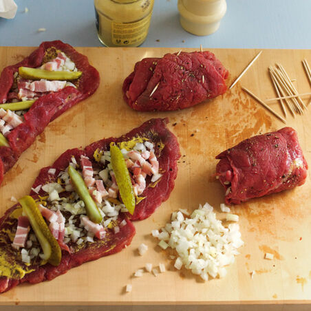Für die Rouladen die Zwiebeln schälen und fein hacken. Gewürzgurken und Speck in Streifen schneiden. Die Rouladen auf der Arbeitsfläche ausbreiten, mit Küchenpapier trocken tupfen, salzen und pfeffern. Mit je ½ EL Senf bestreichen und je 2 EL Zwiebelwürfel daraufstreuen (den Rest beiseitestellen). Mit Speck- und Gurkenstreifen belegen, dabei einen Rand von ca. 2 cm frei lassen. Die Rouladen von der Schmalseite her fest aufrollen, die Seiten dabei nach innen schlagen, sodass die Füllung nicht herausquellen kann. Mit Spießchen feststecken oder mit Küchengarn binden. 1 TL gekörnte Brühe in 400 ml heißem Wasser auflösen.