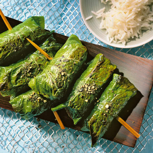Pfefferblätter auf Küchenpapier trocknen. Jeweils etwas Fleisch auf ein größeres Pfefferblatt geben und aufrollen. Jeweils 3 Röllchen auf 1 Holzspieß stecken. Das Öl in einem Wok oder einer breiten Pfanne stark erhitzen. Die Spießchen darin in Portionen scharf anbraten. Die Hitze reduzieren und die Spießchen in 12-14 Min. fertig garen. Mit Reis servieren.