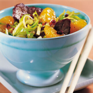 Das Fleisch mit Lauch, Ingwer, Reiswein, 1 EL Sojasauce und Zucker mischen und kurz marinieren.