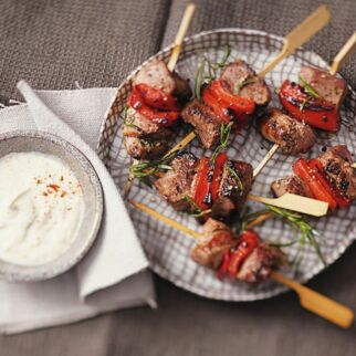 Die Fleischstreifen ziehharmonikaförmig so auf die Spieße stecken, dass sie zwei- bis dreimal durchgestochen werden. Mit Salz und Pfeffer würzen und im Backofen etwa 8 Min. grillen.