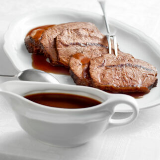 Dann Tomatenmark unter Fleisch und Zwiebeln mischen und 5 Min. unter Rühren anrösten, dabei den Bratsatz mit dem Kochlöffel vom Boden »abkratzen«. Mit dem Wein ablöschen und 3 Min. einkochen lassen, den Bratenfond dazugießen und aufkochen. Rindsgulasch zugedeckt in ca. 1 Std. 45 Min. bei geringer Hitze weich schmoren lassen.