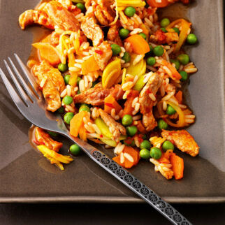Inzwischen die Erbsen in einem Sieb heiß abbrausen und abtropfen lassen. Am Ende der Garzeit unter den Gemüsereis mischen. Die Sahne dazugießen und alles 2-3 Min. kräftig kochen lassen. Die Risi-Bisi-Pfanne mit Salz und Pfeffer würzen.
