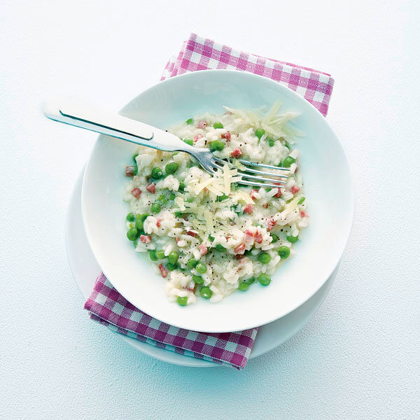 Nach ca. 20 Min., wenn der Reis gar ist, die Erbsen und den Schinken unterheben und erwärmen. Die Sahne steif schlagen. Kurz vor dem Servieren Käse, Butter und Sahne vorsichtig unter den Reis heben. Das Risi-Pisi mit Salz und Pfeffer würzen und in tiefe Teller geben.