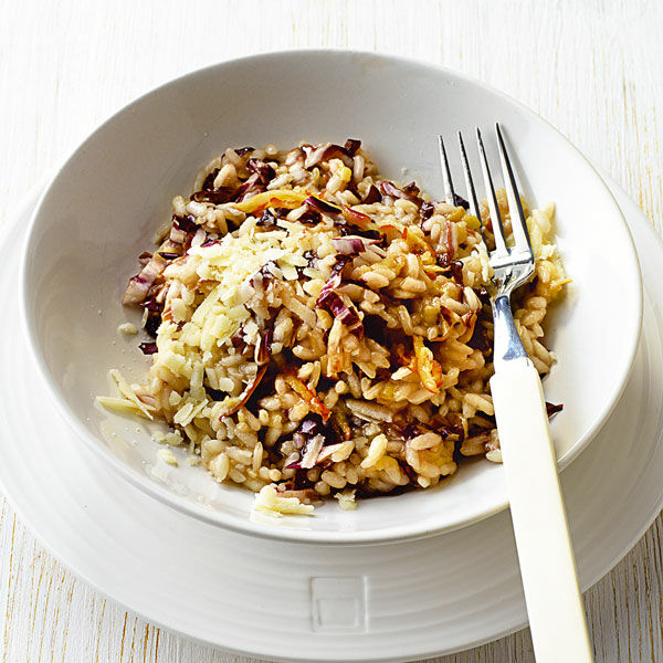 Kurz vor Ende der Garzeit Parmesan, Apfelraspel und Radicchio vorsichtig unter den Reis heben. Das Risotto salzen, pfeffern und einige Min. ziehen lassen.