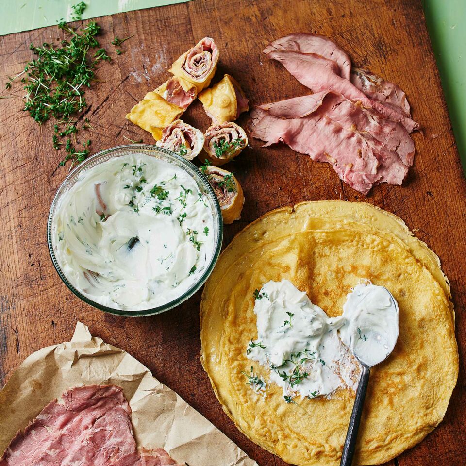 Hingucker-Fingerfood-Snack: In schmale Schnecken geschnitten werden die gefüllten Pfannkuchen zum idealen Fingerfood.