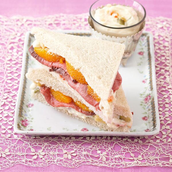 Den aufgefangenen Orangensaft unter den übrigen Sandwichspread mischen, auf die Roastbeefscheiben klecksen. Die unbestrichenen Brotscheiben auflegen und leicht andrücken. Die Sandwiches diagonal halbieren, halb in Papierservietten einwickeln. Zu kräftigem Ceylon-Assam-Tee servieren.