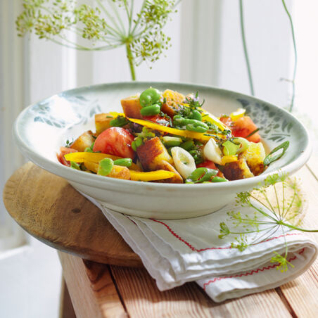 Die Bohnen mit den anderen vorbereiteten Zutaten und den Oliven in einer Salatschüssel mischen, 3 EL Essig unter den Salat mischen. Mit Salz und Pfeffer würzen. Die Brotwürfel unterheben. Den Salat auf Teller verteilen. Nach Belieben mit dem Olivenöl und etwas Essig beträufeln.