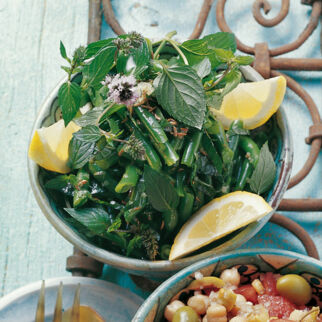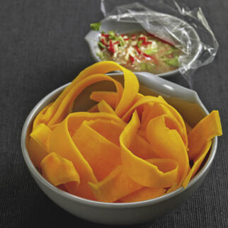 Die Süßkartoffel schälen, kalt abwaschen, eventuell längs halbieren und mit dem Sparschäler feine Streifen abziehen. Die Chilischote längs halbieren, entkernen, waschen und in feine Streifen schneiden. Die Frühlingszwiebel putzen, waschen und in sehr feine Ringe schneiden. Die Minze waschen und trocken schütteln, die Blättchen abzupfen und grob hacken.