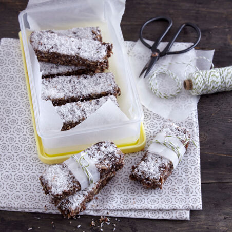 Die Masse in 15 Riegel schneiden. Dafür das Rechteck erst längs in fünf Streifen schneiden, dann die Streifen quer in drei Teile teilen. Gut abgedeckt halten sich die Riegel im Kühlschrank ca. 2 Wochen. Zum Mitnehmen die Riegel in Alufolie oder Pergamentpapier wickeln oder in einen gut schließenden Behälter geben und kühl stellen, damit sie nicht bröselig werden.