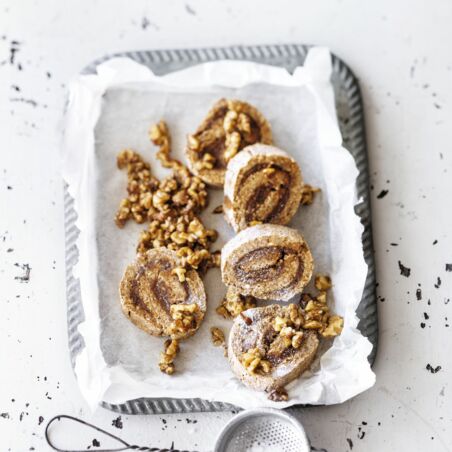 Für die Zimtfüllung die Walnüsse grob hacken. Dattelpaste, Kokosblütenzucker, Zimtpulver und Rosinen in einer Schüssel verrühren und die Walnüsse untermischen. Den Teig mit der Walnussmischung bestreichen und mithilfe des unteren Backpapiers aufrollen. (Falls der Teig dabei einreißt, die Risse einfach mit dem Finger zustreichen.) Die Rolle in 12 Scheiben schneiden und auf ein mit Backpapier belegtes Blech stellen (nicht legen). Die Schnecken im Backofen bei 50° (Umluft; Mitte) und leicht geöffneter Ofentür etwa 2 Std. oder im Dörrgerät bei 42° etwa 3 Std. trocknen lassen.