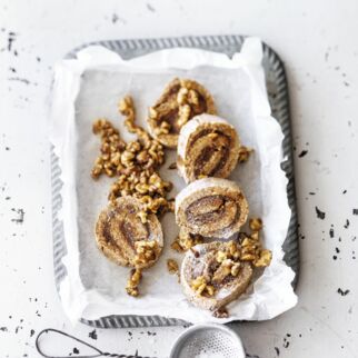 Das obere Backpapier abziehen, den Teig mit der Mohnfüllung bestreichen und mithilfe des unteren Backpapiers aufrollen. (Falls der Teig dabei einreißt, die Risse einfach mit dem Finger zustreichen.) Den Strudel in 12 Scheiben schneiden und auf ein mit Backpapier belegtes Blech stellen (nicht legen). Die Scheiben im Backofen bei 50° (Umluft; Mitte) und leicht geöffneter Ofentür etwa 2 Std. oder im Dörrgerät bei 42° etwa 3 Std. trocknen lassen.