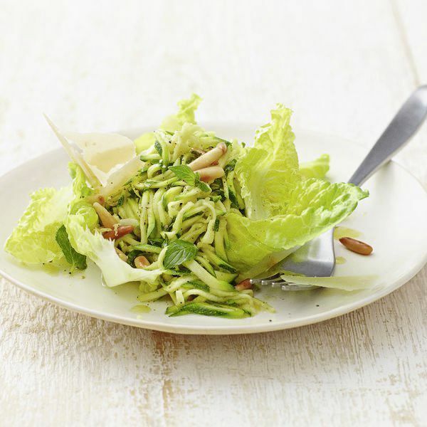 Heute spielen Zucchini mal die Hauptrolle auf dem Teller: in feine Streifen geschnitten, serviert als sommerlicher Salat. Pinienkerne sorgen für den richtigen Biss.