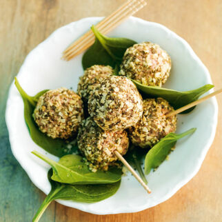 Die Walnusskerne in einer Pfanne ohne Fett rösten. Dann im Mixer oder mit einem großen Messer fein hacken. Aus der gut gekühlten Käse-Mischung kleine Bällchen formen und diese in den gehackten Walnüssen wälzen. Die Bällchen nach Belieben auf Radicchioblättern servieren.