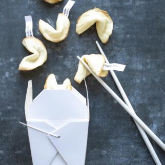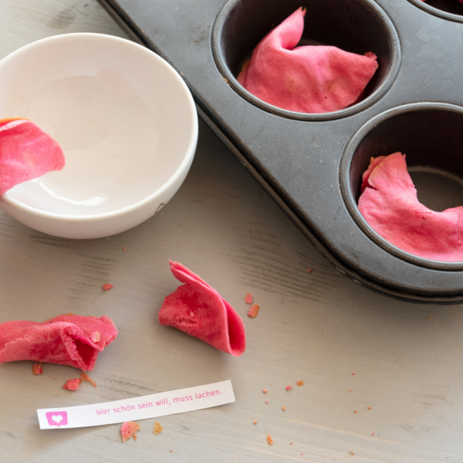 Mithilfe eines Teelöffels den Teig portionsweise (jeweils ca. 1,5 TL Masse) dünn und rund auf ein mit Backpapier ausgelegtes Blech streichen. Dabei maximal 4 Glückskekse gleichzeitig im Ofen backen, da die Kekse noch warm geformt werden müssen.