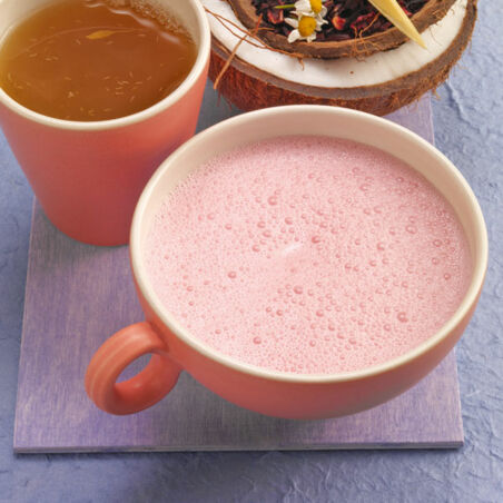 Dieser Tee wird aus Blüten, Zitronengras und – sehr raffiniert – Kokosmilch gekocht. Heraus kommt eine zartrosa, cremige Köstlichkeit.