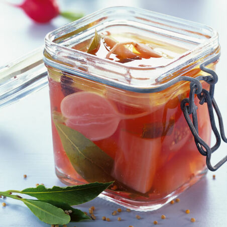 Essig, Wein, Salz, Zucker und Gewürze aufkochen lassen. Rettiche und Radieschen dazugeben, kurz aufkochen lassen. In Twist-off-Gläser füllen, das Gemüse muss vollständig vom Sud bedeckt sein. Obendrauf einige Lorbeerblätter legen und mit einer dünnen Schicht Öl luftdicht abschließen. Die Gläser sofort verschließen und kühl und dunkel lagern.
