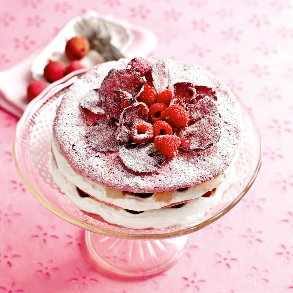 Die zarten Baiserböden bekommen eine fruchtige Füllung aus Sahne, Litschis und Himbeeren.
