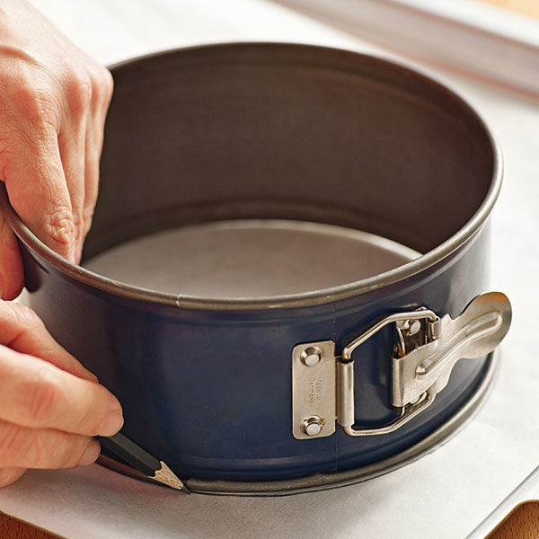 Den Backofen auf 140° Umluft vorheizen. Mithilfe der Springform drei Kreise auf je einen Bogen Backpapier zeichnen und je einen Bogen auf ein Backblech legen.