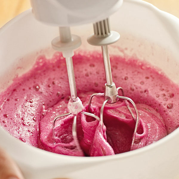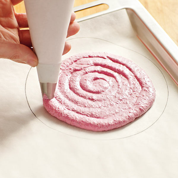 Für das Baiser die Eiweiße mit Rote-Bete-Saft, Rosenwasser und 1 Prise Salz mit den Quirlen des Handrührgeräts steif schlagen. Den Puderzucker daraufsieben und mit den Mandeln mit einem Spatel vorsichtig unterziehen. Baiser in einen Spritzbeutel mit großer Lochtülle füllen und drei Böden kreisförmig auf das Backpapier spritzen. Alle drei Böden gleichzeitig im heißen Ofen ca. 20 Min. backen. Die Böden sollten trocken sein, sich aber noch etwas elastisch anfühlen. Dann herausnehmen, umgekehrt auf ein Kuchengitter legen und das Papier vorsichtig abziehen.