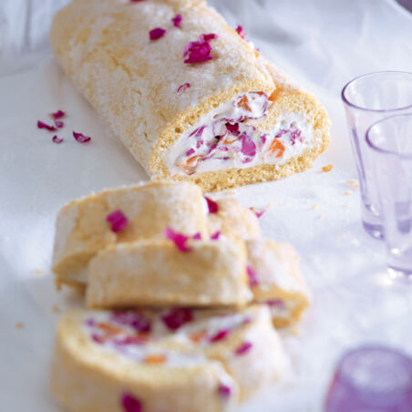 Bestreuen Sie die Biskuitrolle mit gezuckerten Rosenblättern: Wildrosenblütenblätter in Zitronensaft tauchen, abtropfen lassen, in Zucker wälzen & trocknen lassen.